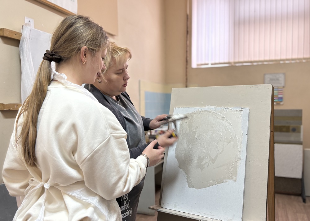 На мастер-классе «Декорирование стен» педагоги Светлана Петрова и Елена Матрохина показали школьникам технологии нанесения отделочного материала «Мокрый шелк», «Морской бриз» и «Морозная свежесть». Елена Бочарникова разграничила понятия декоративной, мокрой и сухой штукатурки, а также рассказала об устойчивой к влаге аквапанели, которая использовалась при возведении фасадов на Олимпиаде в Сочи.