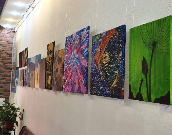 В экспозиции представлены 62 работы, выполненные в различных художественных техниках: сухая и масляная пастель, горячий батик, свободная роспись, акрил на холсте и бумаге. На них изображены птицы, коты и животные Астраханского заповедника.